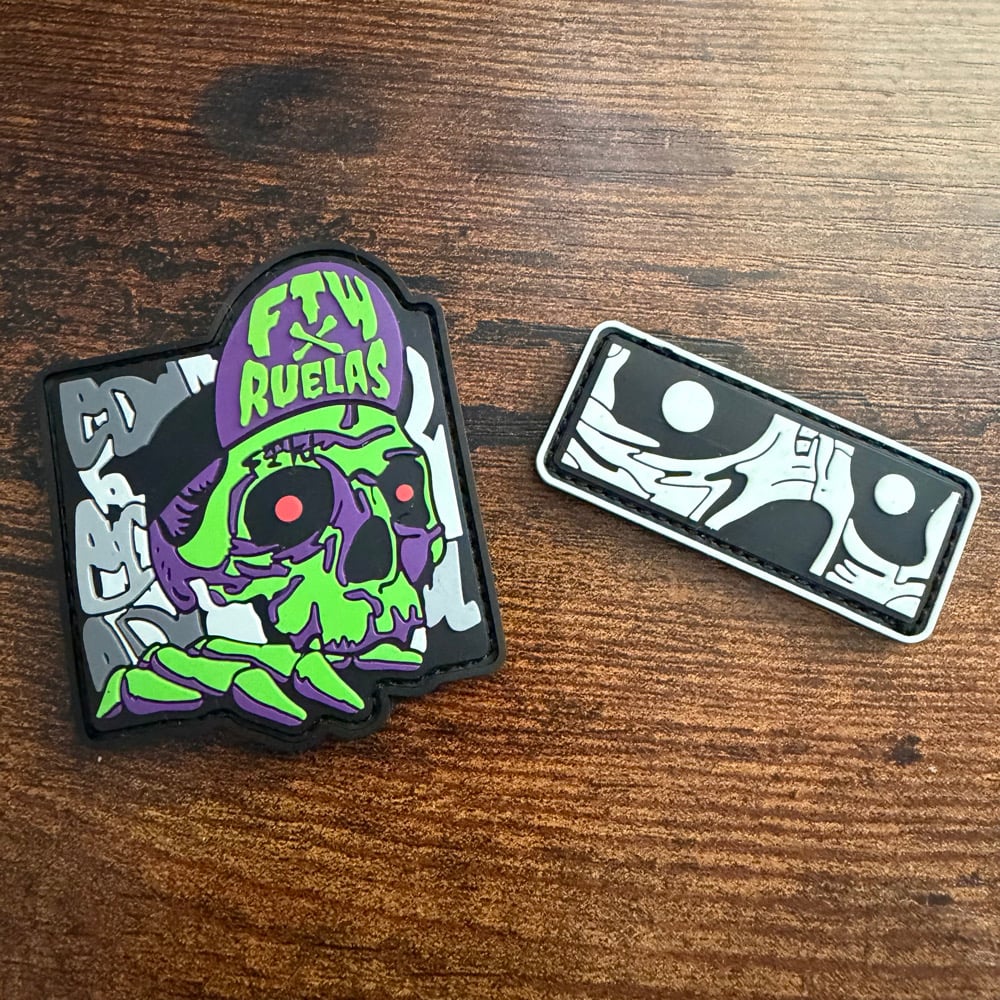 " Collab Tres” patch set comes with 2 patches (1 Full color , and 1 black & white glow in the dark patch) , and 1 slap. Only 30 sets made. Patches are approximately 2.5x2.75” and the smaller one is 2x.80”. We are not responsible once your package has been shipped. Plate carrier not included, just show for example .Quantities are limited and cannot be replaced.