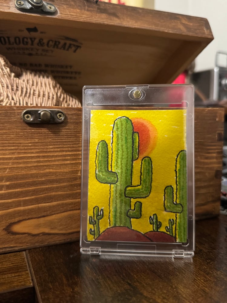 "Desert Dreaming" Original artwork done with Sakura Pen and alcohol marker , on Arches fine cold pressed cotton paper. This is a 1 of 1 approximately 2.5x3.5". Signed on the back and placed inside a 180pt slab. We are not responsible for packages once it's left our hands.